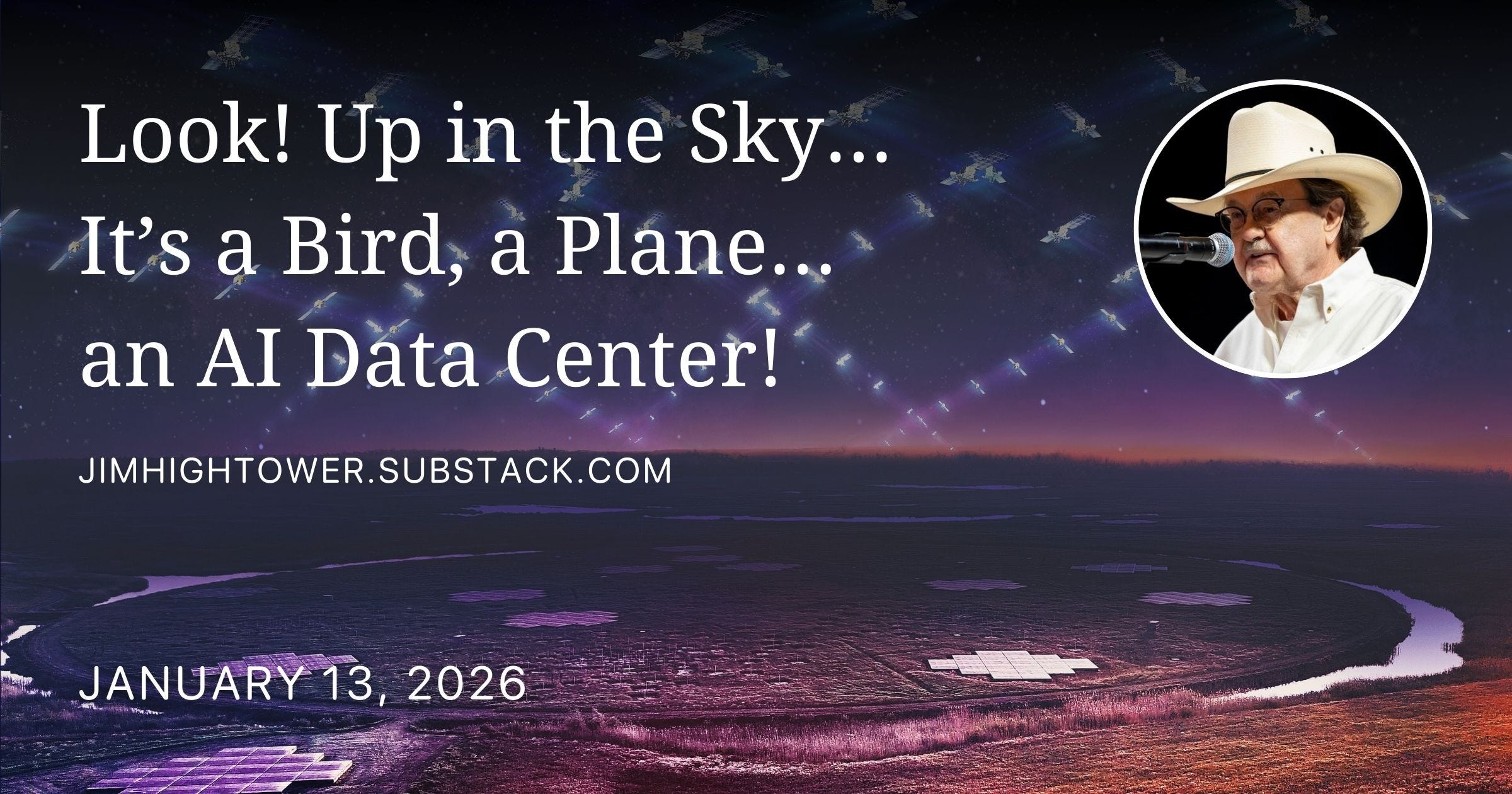 This is Jim Hightower saying… Lest you think that, surely they wouldn’t do this, note that those arrogant billionaire Lords of the Night are already investing humongous sums of money in space data centers As the CEO of one called “Starcloud” bluntly says: “It’s not a debate. It’s going to happen.”